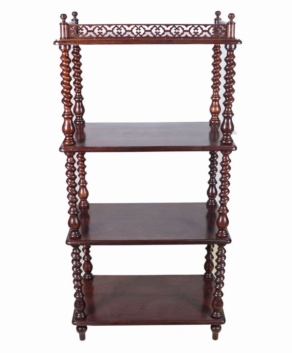 Etagere in mogano a quattro piani, con montanti a colonnine tornite a tortiglione e ringhierina traforata sul piano
