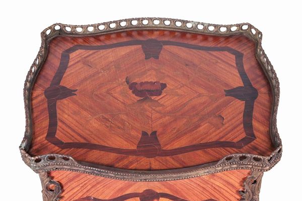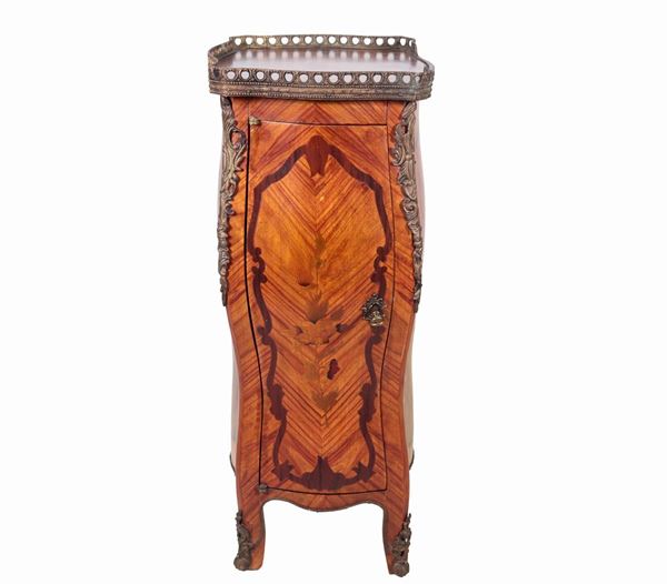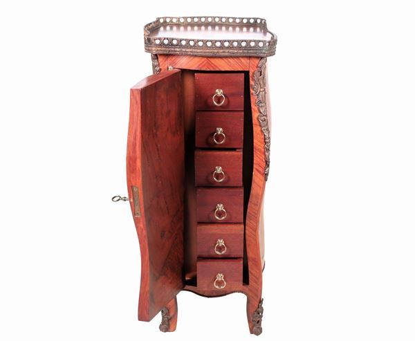 Mobilino francese portamonete in bois de rose ed ebano viola, a forma rettangolare centinata e bombata, interamente intarsiato a volute e fiori. [..]