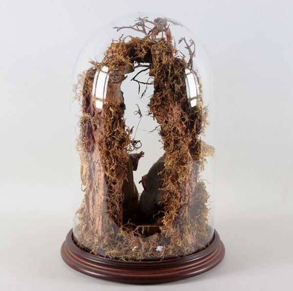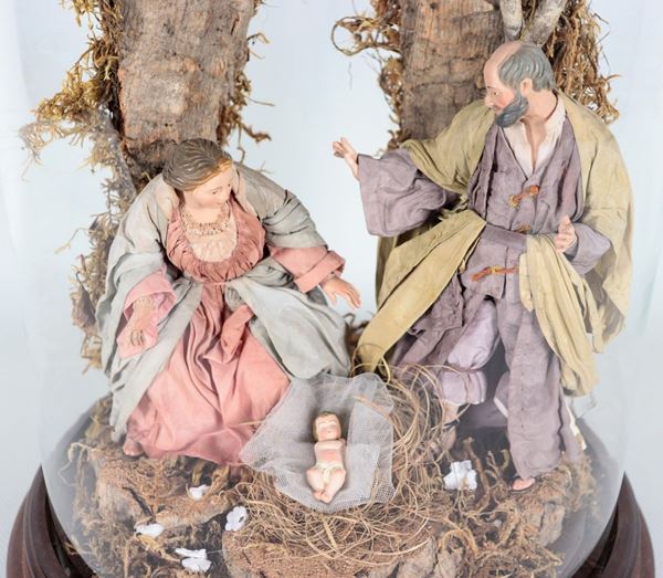 "Natività", pupazzi napoletani da presepe in terracotta e legno con campana in vetro soffiato e base tonda in noce