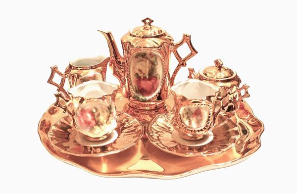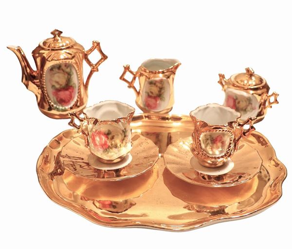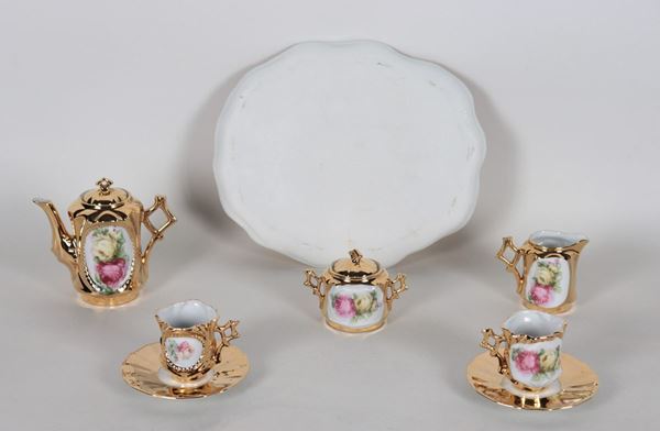 Tète à tète in porcellana francese interamente dorata in oro zecchino, con decorazioni variopinte a medaglioni floreali (6 pz)