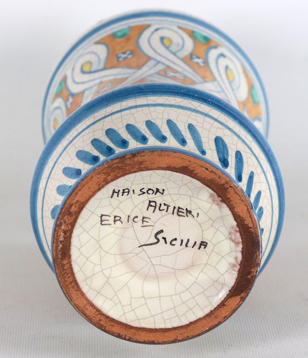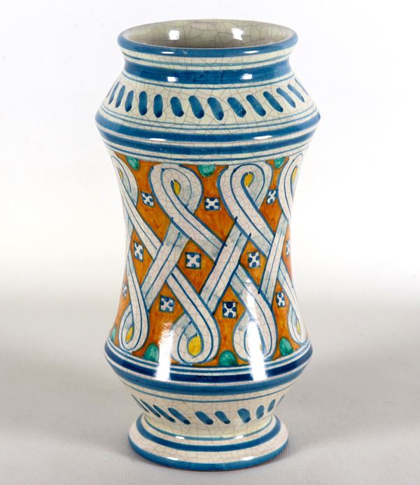 Albarello in maiolica siciliana decorata a motivi di intrecci geometrici su fondo giallo ocra