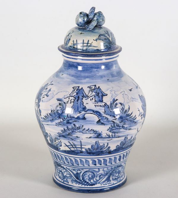 Anfora con coperchio in maiolica italiana lustrata, interamente decorata in blu con paesaggi