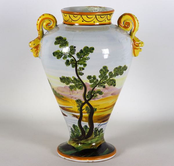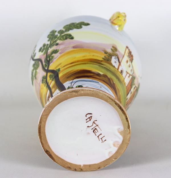 Anfora in maiolica policroma di Castelli, con decorazioni a motivo di paesaggio e borgo con alberi. Difetto all'interno del collo e lievi sbeccature [..]