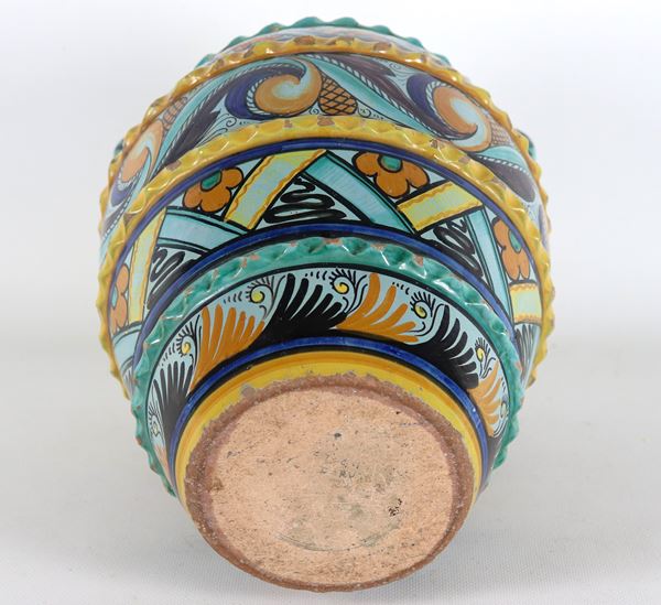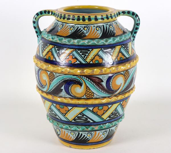 Anfora per acqua in maiolica italiana, interamente decorata a volute, fiori e motivi geometrici