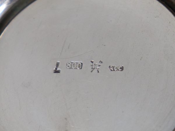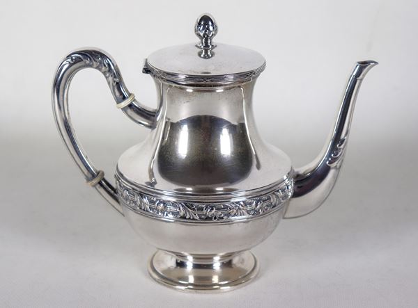 Antica caffettiera in argento cesellato e sbalzato con ghirlanda centrale di fiori, gr. 390