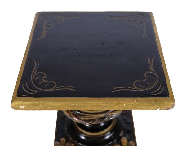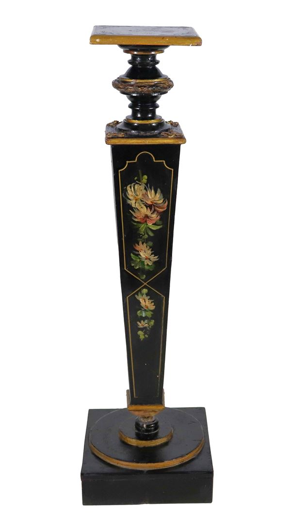 Antica colonna Liberty a forma quadrangolare in legno ebanizzato, con decorazioni dipinte a motivi floreali e profili dorati