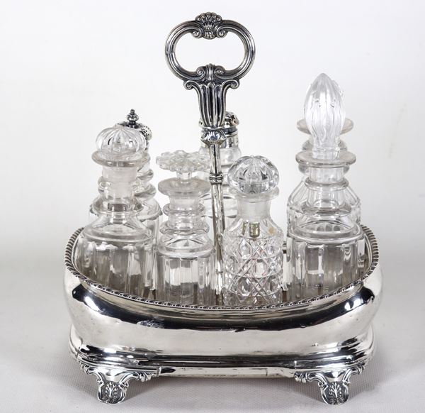 Antica cruet Epoca Regina Vittoria in argento cesellato e sbalzato, sorretta da quattro piedini ricurvi, sette flaconi in cristallo lavorato [..]