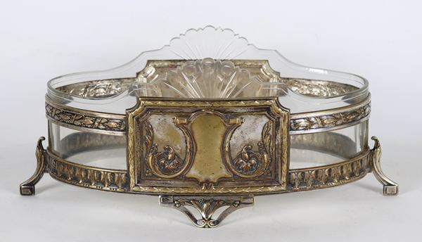 Antica fioriera tedesca Liberty in metallo argentato, cesellato e sbalzato, all'interno vasca in cristallo