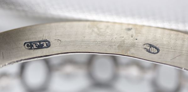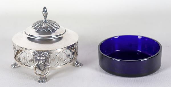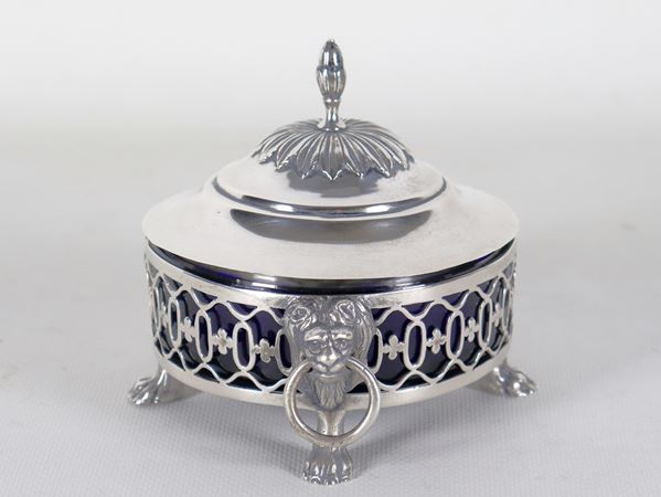 Antica formaggiera in argento cesellato, sbalzato e traforato a motivi Impero, con mascheroni di leoni e quattro piedini leonini, all'interno [..]