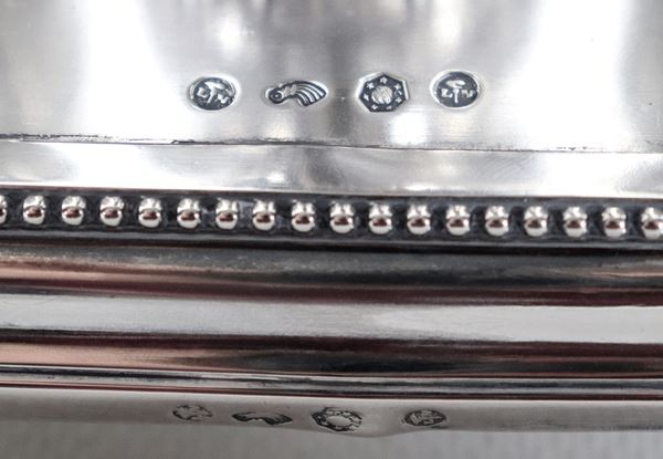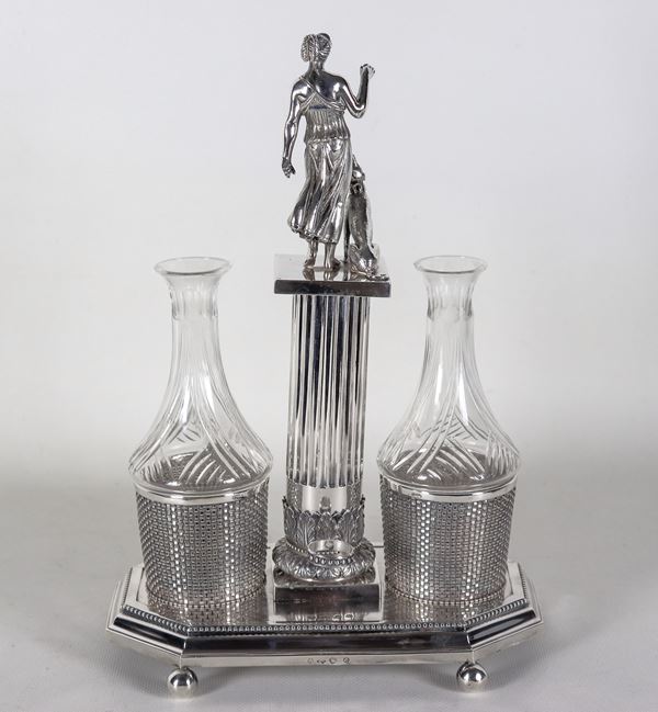 Antica oliera in argento cesellato e sbalzato a motivi neoclassici con scultura di Venere e cane, due ampolle in cristallo mancanti dei tappi, [..]