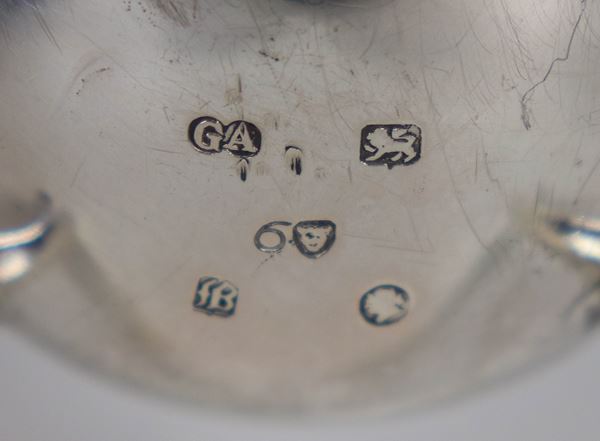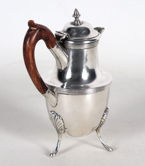 Antica piccola caffettiera Epoca Regina Vittoria, in argento cesellato e sbalzato con manico in legno e tre piedini ricurvi. Bolli Londra 1837, [..]