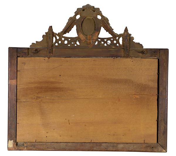Antica piccola specchiera lucchese Luigi XVI in legno decorato e dorato con intagli e cimasa traforata, specchio al mercurio