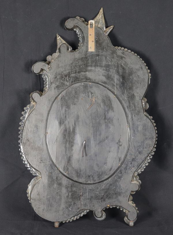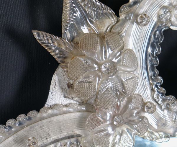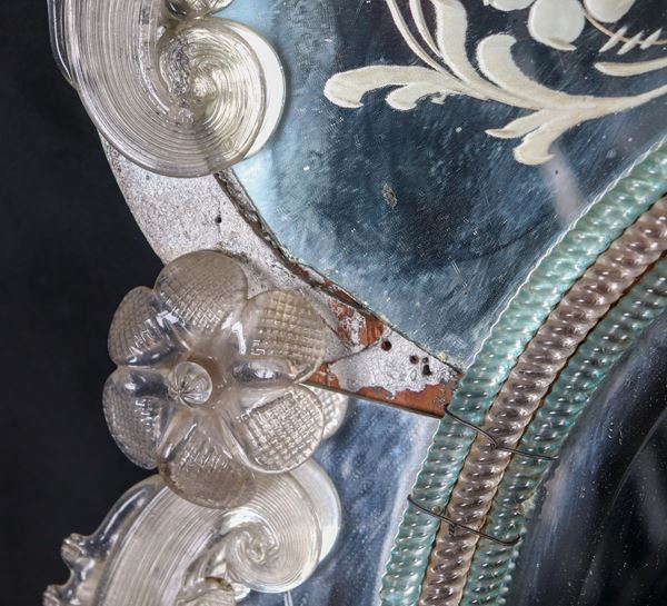 Antica piccola specchiera ovale in vetro soffiato di Murano, con applicazioni di fiori e vetri del bordo incisi. Lievi mancanze