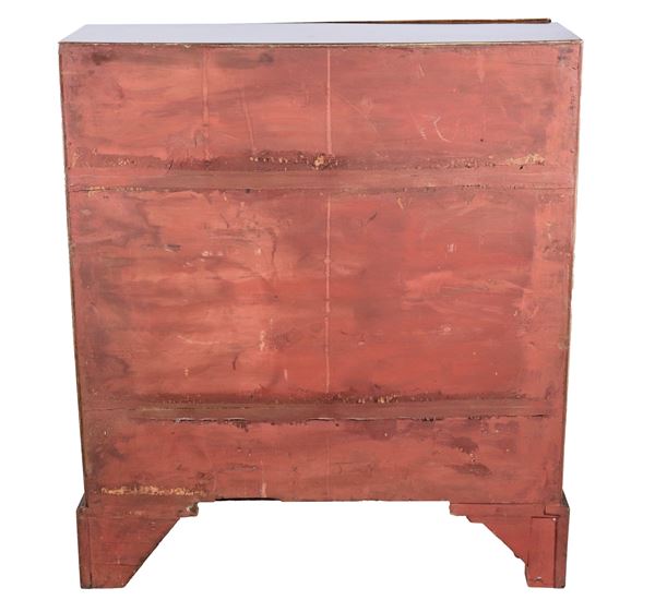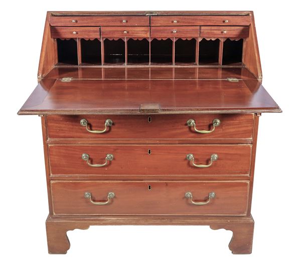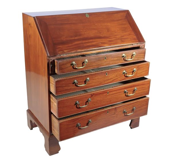 Antica ribalta inglese vittoriana in mogano massello, con calatoia formante scrittoio, quattro tiretti sottostanti e gambe a cattella