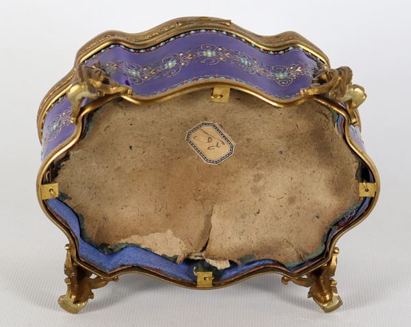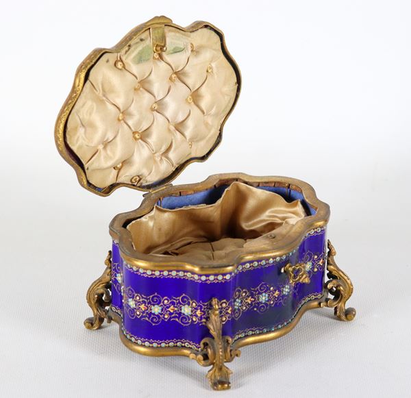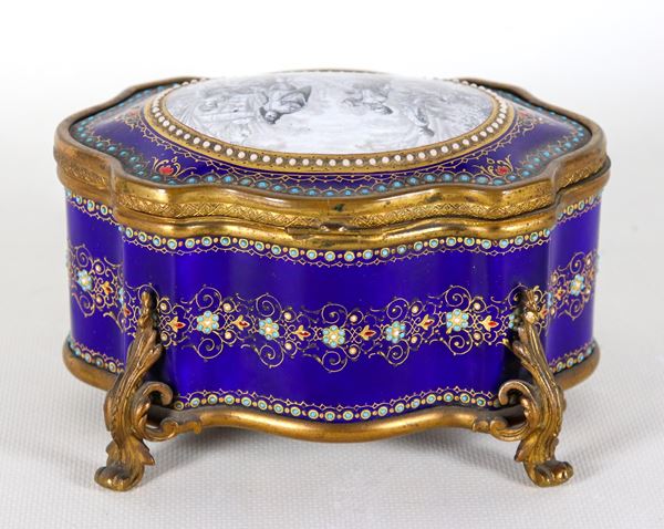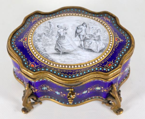 Antica scatola francese a forma ovale centinata in smalto blu cobalto con ghirlande floreali, sul coperchio medaglione dipinto con “Scena galante”, [..]