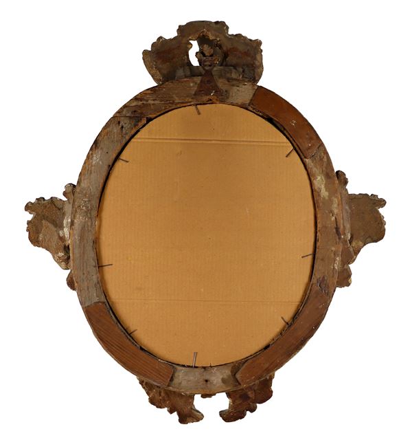 Antica specchiera ovale Luigi XV, in legno dorato e intagliato a motivi di foglie d'acanto, specchio al mercurio