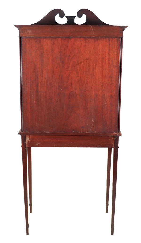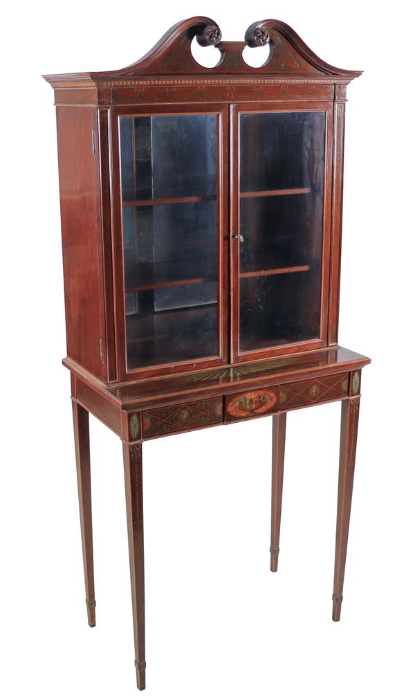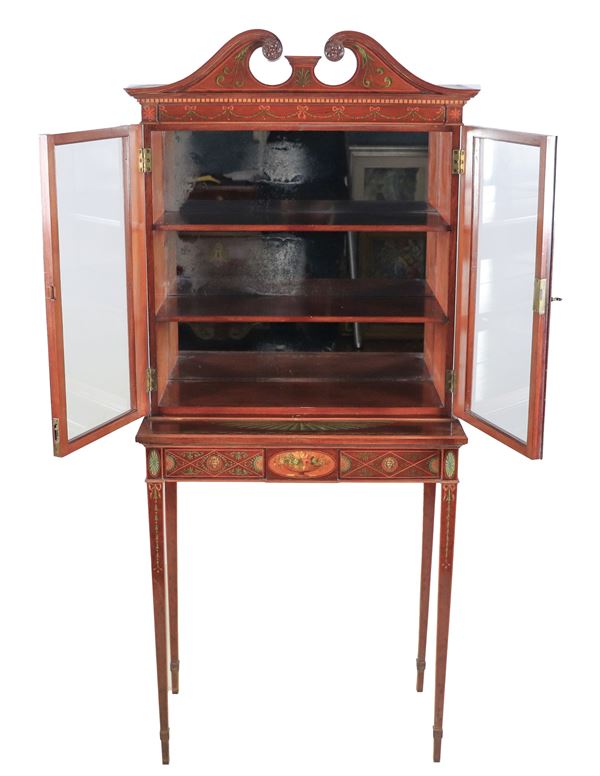 Antica vetrina inglese Sheraton in mogano, con intarsi variopinti a motivi di ghirlande con fiocchi, rosoni e filettature intrecciate. La parte [..]