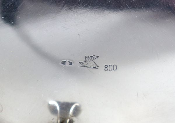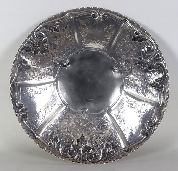 Antico centrotavola tondo in argento, cesellato e sbalzato a rilievo a volute di foglie d'acanto e mazzetti di fiori con applicazioni di pietre [..]