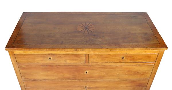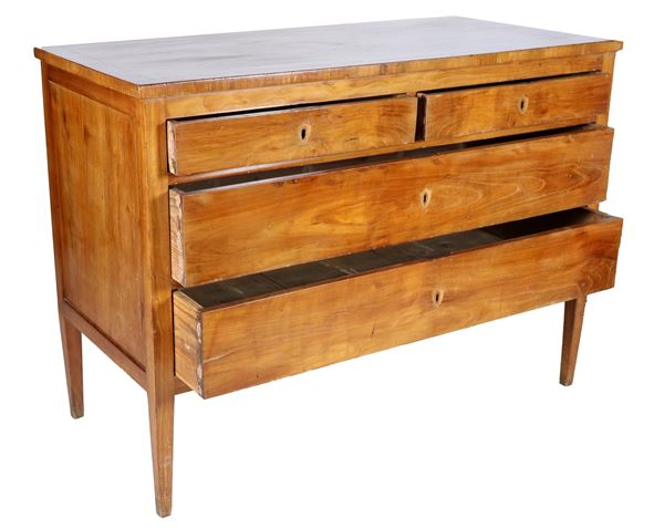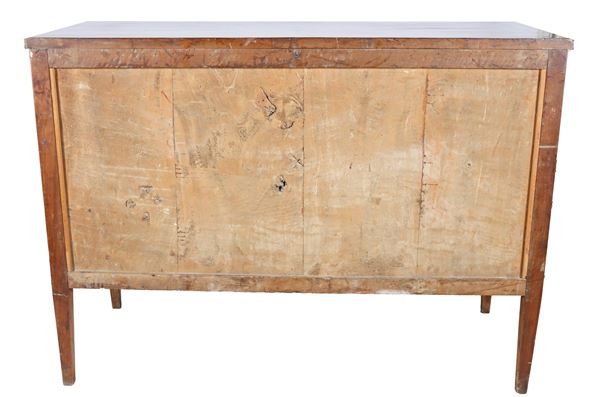 Antico comò in noce di linea Luigi XVI, con rosone intarsiato sul piano, quattro tiretti e gambe a tronco di piramide rovesciata