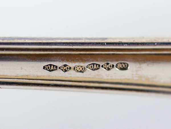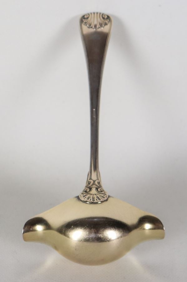 Antico mestolo per salse in argento cesellato e sbalzato con interno in vermeil. Fine XIX Secolo, gr. 175