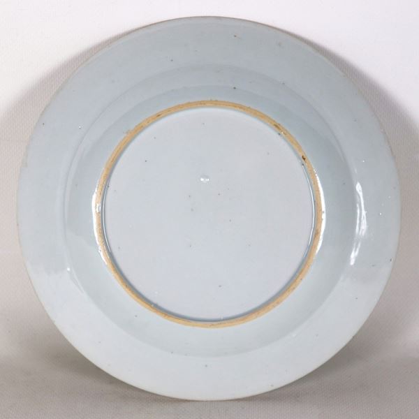 Antico piatto da muro cinese Compagnia delle Indie, in porcellana con decorazioni in smalti policromi a rilievo di fiori, piccola sbeccatura [..]