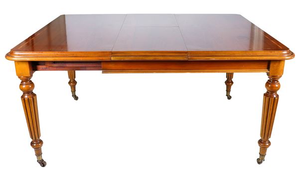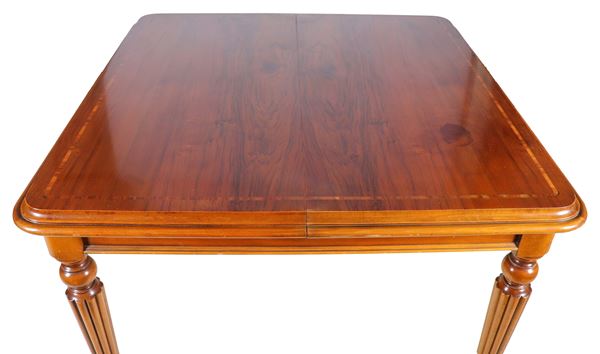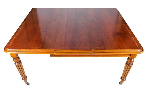 Antico tavolo da pranzo allungabile Epoca Vittoriana in noce, con piano intarsiato a filettature, quattro gambe baccellate e apertura con meccanismo [..]