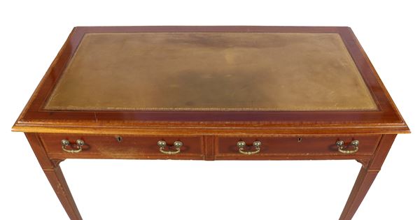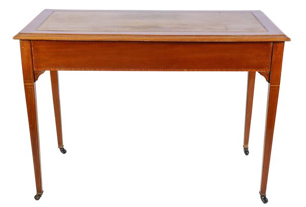 Antico tavolo scrittoio con sedia d'accompagno Epoca Regina Vittoria, in mogano, con filettature intarsiate in legno satinato, due tiretti, [..]