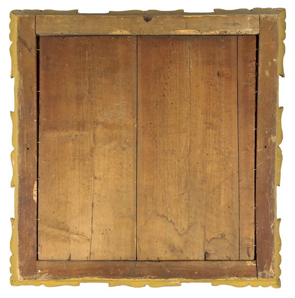 Antico tessuto ricamato “Scena biblica” in antica cornice in legno dorato e intagliato. Il tessuto presenta varie cadute di colore