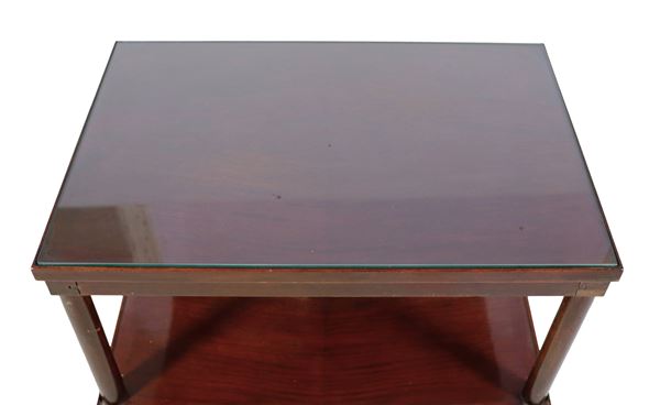 Carrello Anni '50-'60 a forma rettangolare in mogano, con quattro gambe a colonnina e due piani