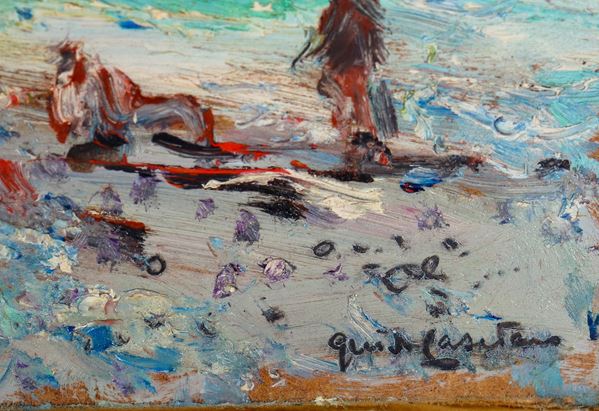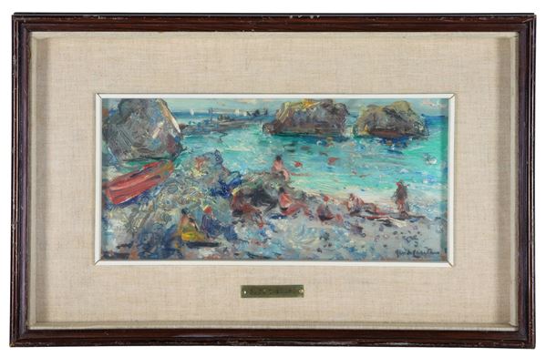 Firmato. "Marina con i bagnanti sugli scogli", piccolo dipinto ad olio su masonite