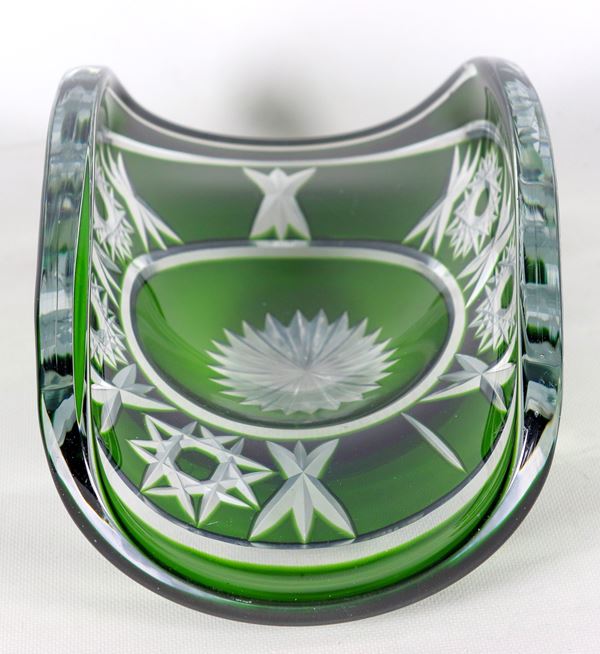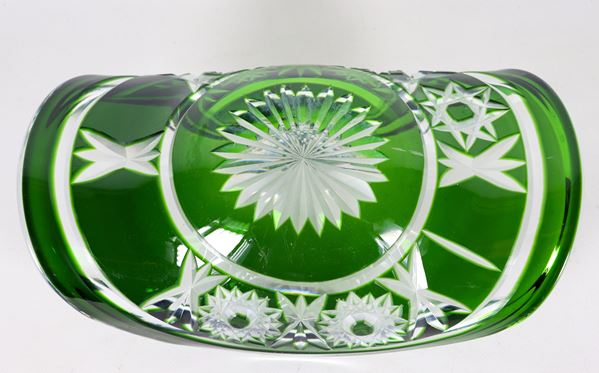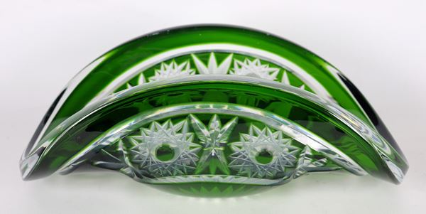 Centrotavola a forma di cesto in cristallo verde di Boemia lavorato a punta di diamante