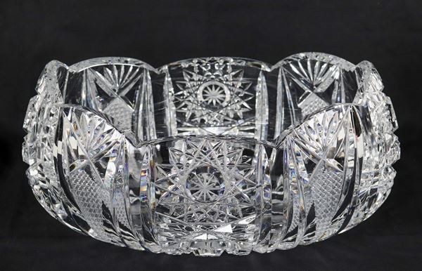 Centrotavola ovale in cristallo di Boemia con bordo centinato, interamente lavorato e inciso