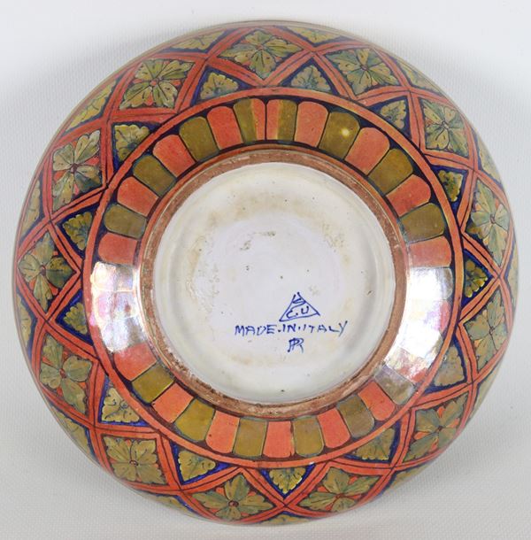 Ciotola in maiolica lustrata Gualdo Tadino - Rubboli, marcata S.C.U., interamente decorata a motivi di anfore, volute floreali e draghi. Anni [..]