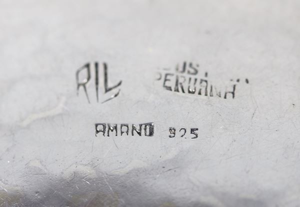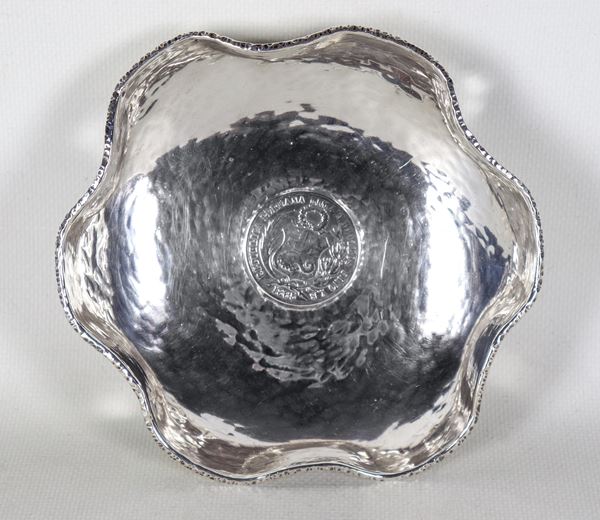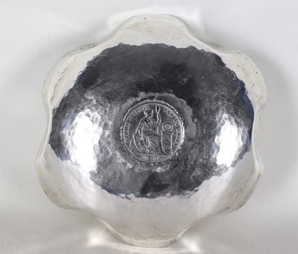 Ciotola tonda in argento martellato Titolo 925, con bordo sagomato e sul fondo moneta commemorativa della Repubblica Peruviana 1865, gr. 200