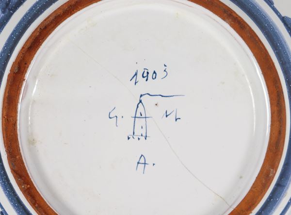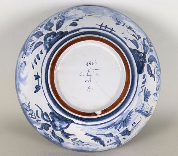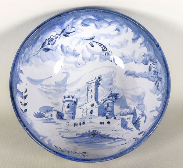 Ciotola tonda in maiolica lustrata di Albisola, interamente decorata in blu a motivo di paesaggio con castello. Sul fondo presenta rottura