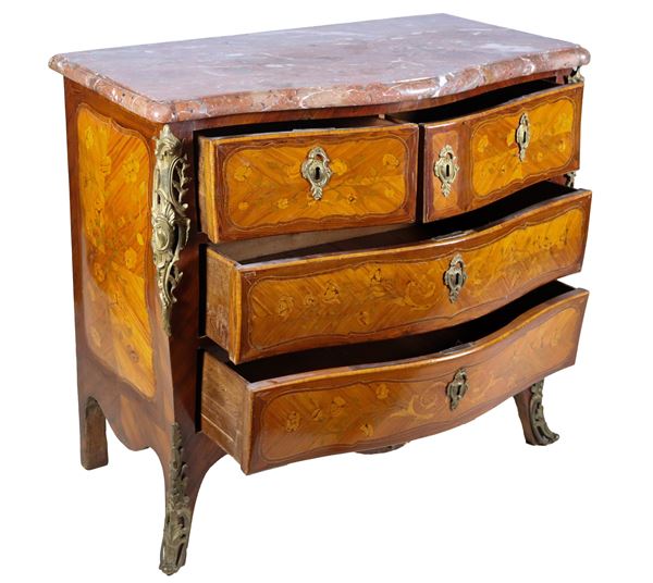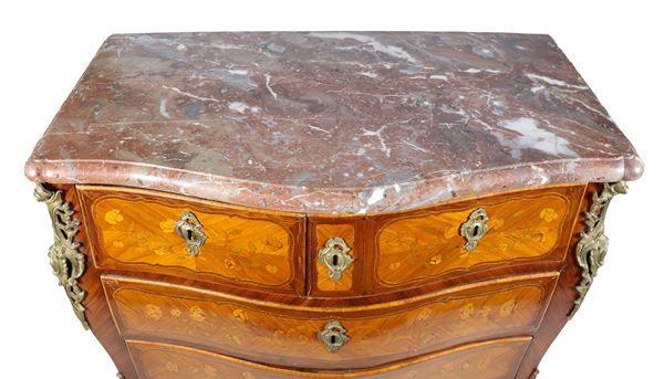 Commode francese Napoleone III (1852-1870) in bois de rose, ebano viola e mogano, con riquadri intarsiati a motivi di intrecci floreali, fregi [..]