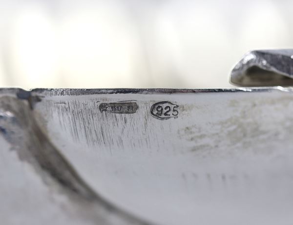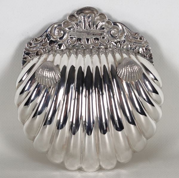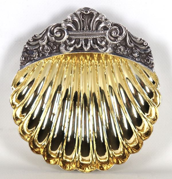 Conchiglia in argento Titolo 925, cesellata e sbalzata a volute con interno in vermeil, sorretta da due sculturine di conchiglie. Annesso astuccio, [..]