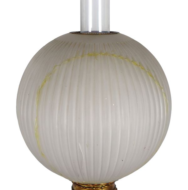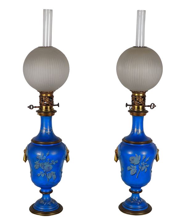 Coppia di antiche lampade a petrolio francesi in vetro laccato blu con decorazioni a motivi floreali, cannule e globi in vetro soffiato. Un [..]