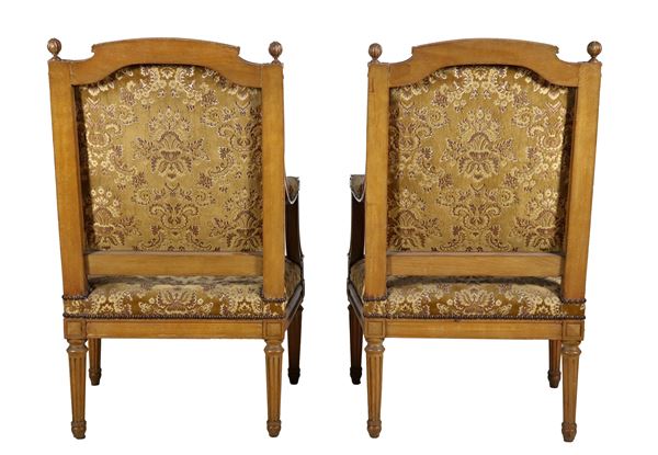 Coppia di antiche poltrone francesi di linea Luigi XVI in legno decapè, intagliate a motivi di perlinature, foglie d'acanto e pigne, quattro [..]
