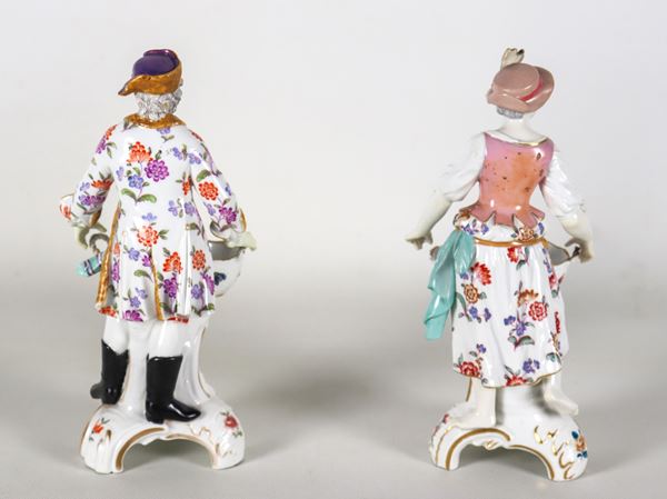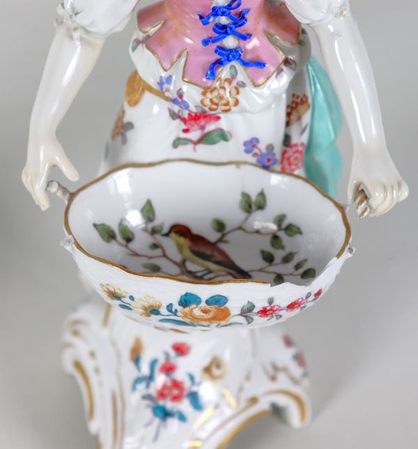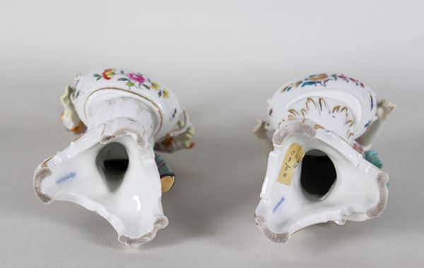 Coppia di antiche saliere in porcellana policroma e smaltata Vecchia Berlino, con sculture raffiguranti "Contadino e contadina con cesti", difetti [..]