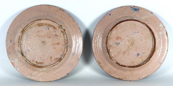 Coppia di antichi piatti da muro in maiolica con decorazioni in blu, al centro stemma gentilizio