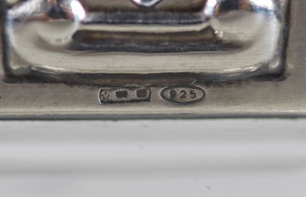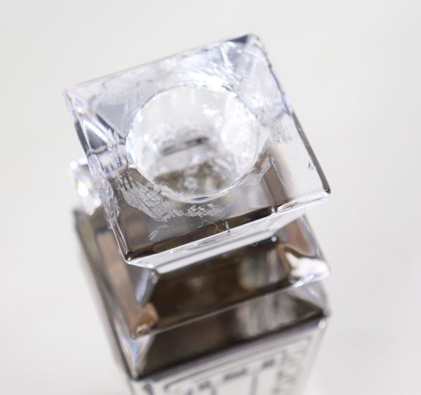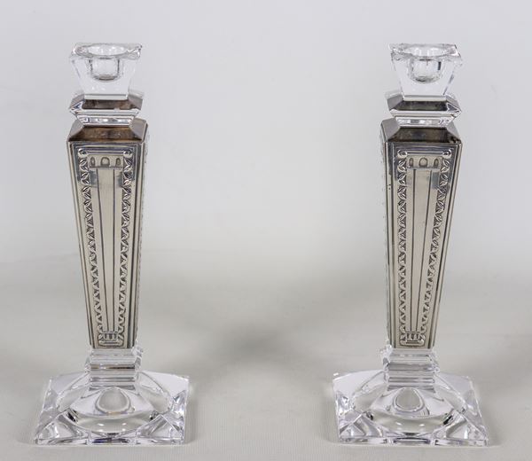 Coppia di candelieri quadrangolari in cristallo, con rivestimento in argento cesellato e sbalzato Titolo 925 , marcati Le Perle. Uno presenta [..]