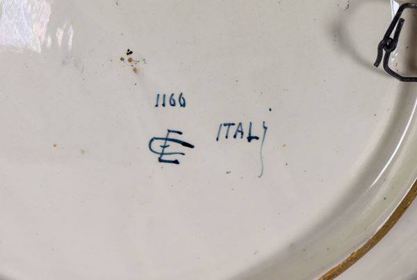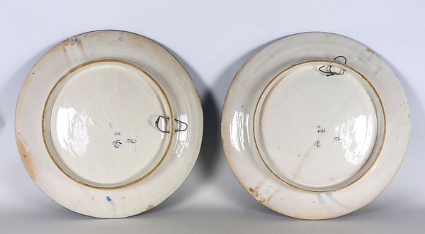 Coppia di grandi piatti da parata in maiolica fiorentina, marcati E.C. (Ernesto Conti Sesto Fiorentino), interamente decorati in blu con scene [..]