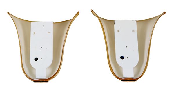 Coppia di lampade da muro a forma di ventaglio, in vetro soffiato di Murano color miele, 1 luce ciascuna. Anni '70