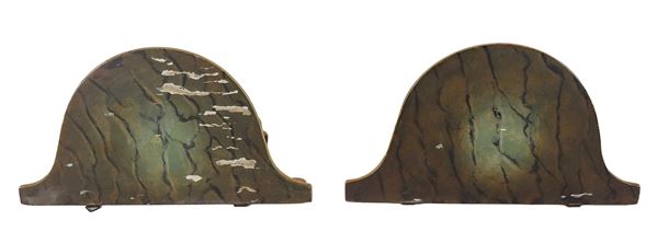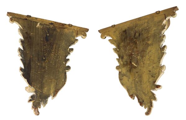 Coppia di piccole mensole da muro in legno decorato e laccato, con sculture ebanizzate di volti di bambini. Alcune scrostature sui piani