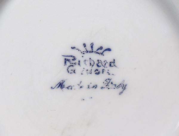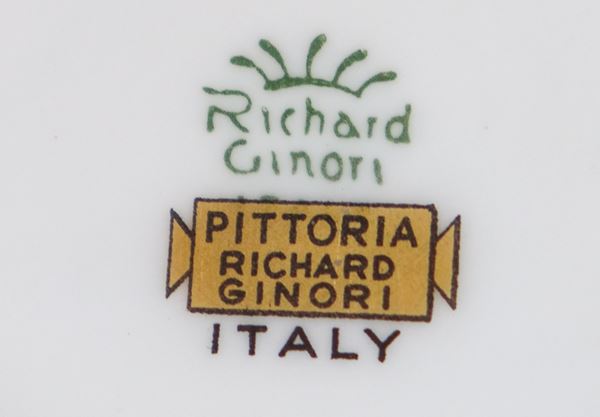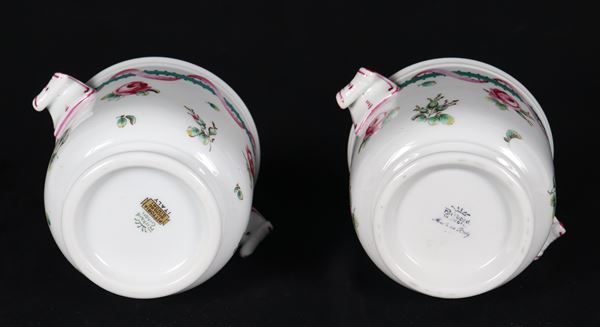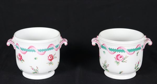 Coppia di piccoli cachepots in porcellana Richard Ginori, interamente variopinti a motivi di cordoni e rose