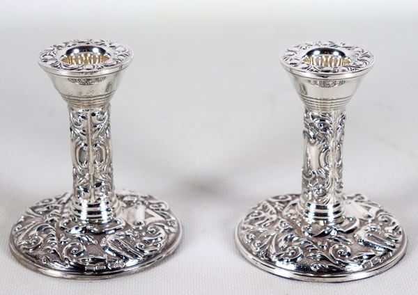 Coppia di piccoli candelieri inglesi in argento interamente cesellati e sbalzati. Bolli Birmingham 1957, gr.160 circa