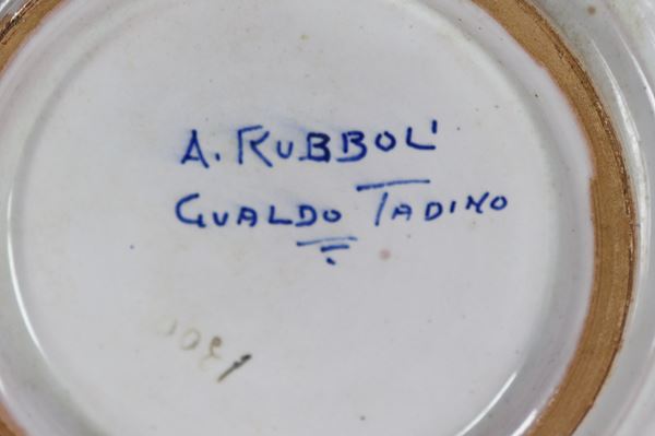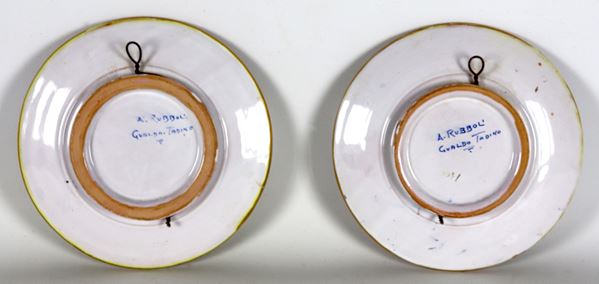 Coppia di piccoli piatti in maiolica lustrata Gualdo Tadino con al centro "Soldati con elmi", marcati Alberto Rubboli (1888-1975)