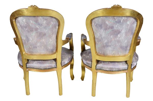 Coppia di poltrone francesi di linea Luigi XV, in legno dorato e intagliato a motivi floreali, braccioli e gambe ricurve