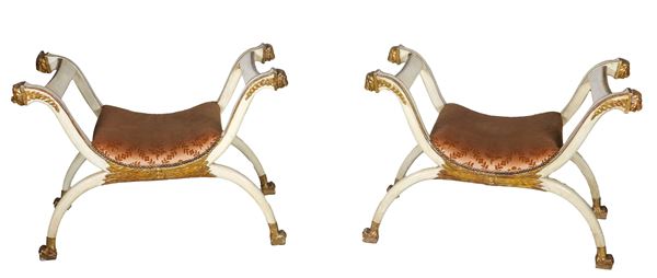 Coppia di sgabelli di linea Impero in legno laccato avorio, con profili e teste di leoni intagliati e dorati